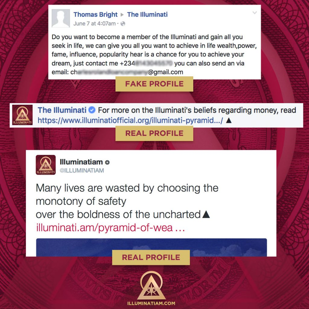 In recent months, we have seen a sharp increase in activity from individuals who falsely claim to be agents of the Illuminati. They appear in droves on social media websites like Facebook and Twitter, spreading misinformation about our beliefs and often demanding money in return for Illuminati membership.